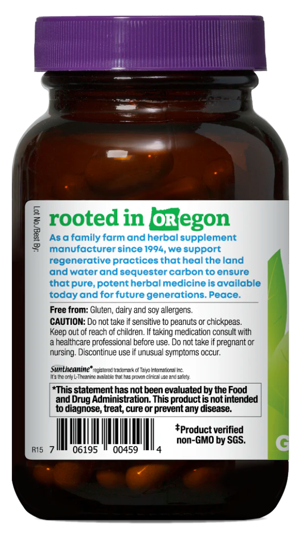 • L-Theanine (Suntheanine®) and organic Skullcap assist in relaxation and reduce anxious feelings without causing drowsiness*