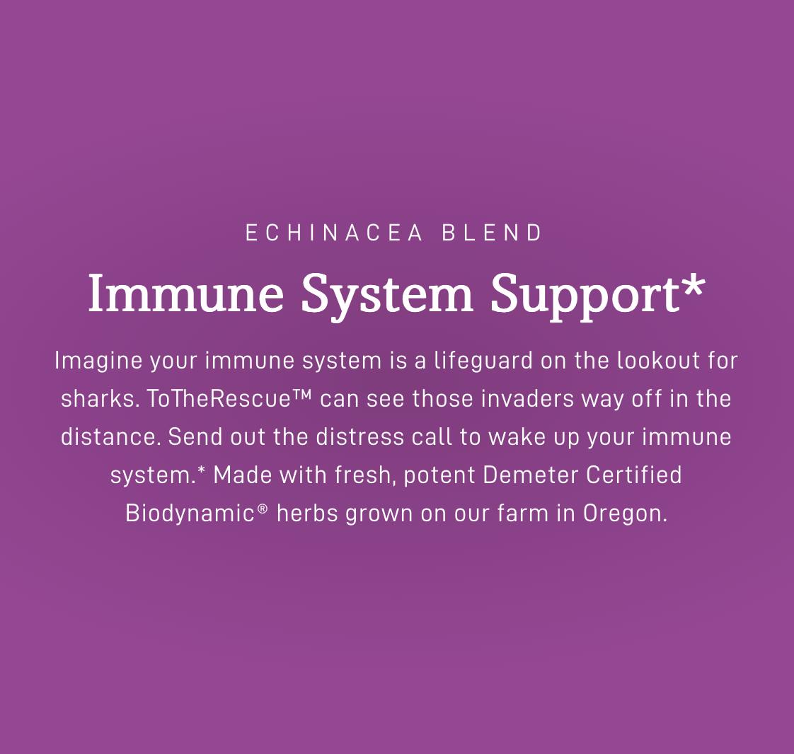 Imagine your immune system is a lifeguard on the lookout for sharks. ToTheRescue™ can see those invaders way off in the distance. Send out the distress call to wake up your immune system.* Made with fresh, potent Demeter Certified Biodynamic® herbs grown on our farm in Oregon.